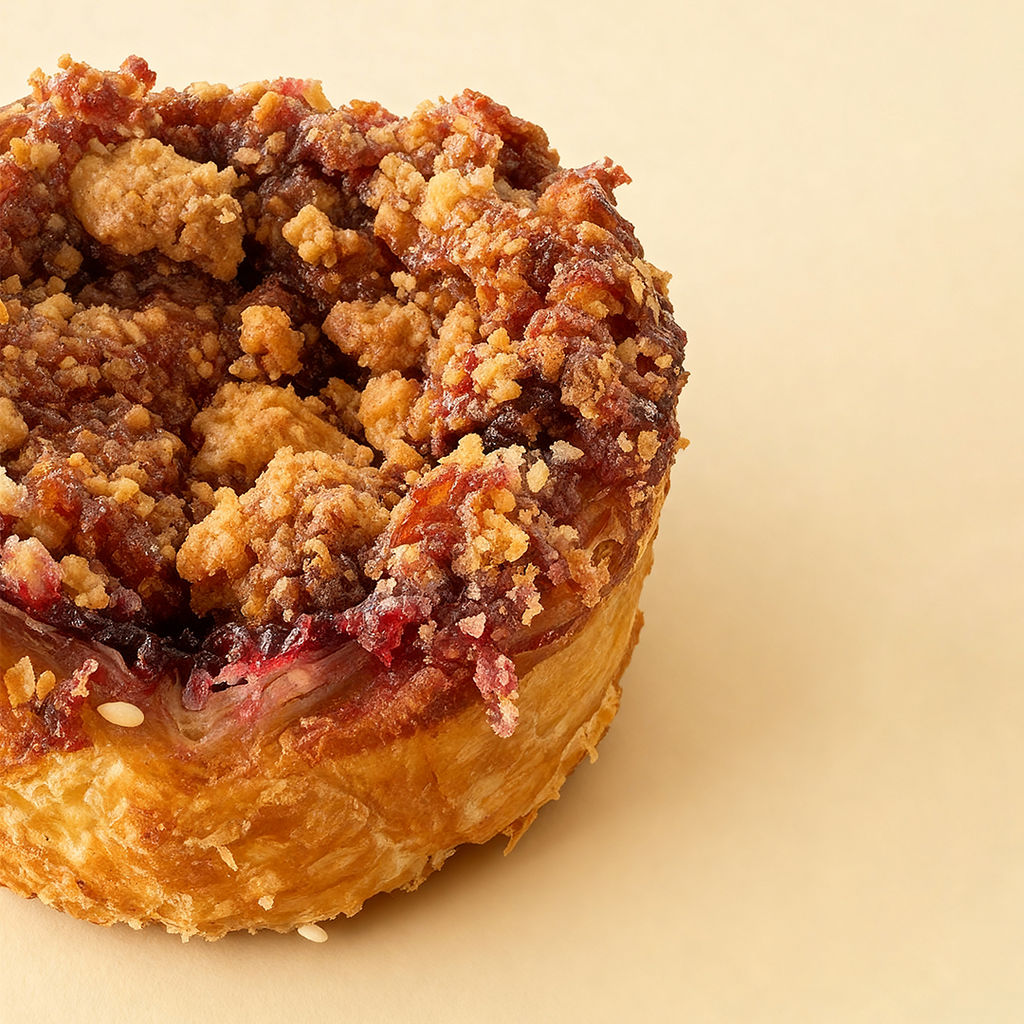 Pie elaborado con una base de hojaldre, relleno de dulce de zarzamora y finalizado con crumble de almendras